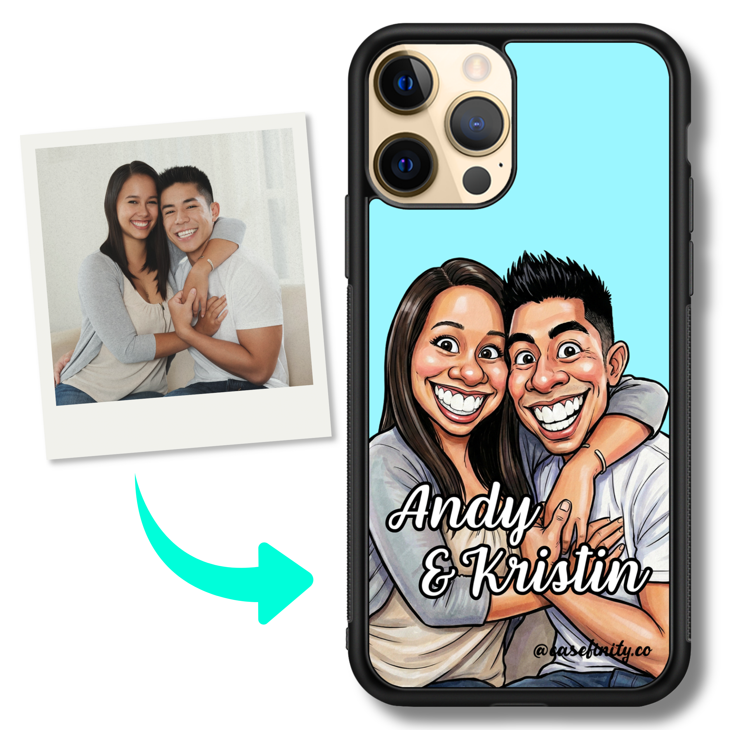 transform your photo into a funny big head caricature portrait printed on a personalised iphone case. custom illustrated for exaggerated features and playful style, finished on a slim, lightweight impact case for a unique personalised gift.